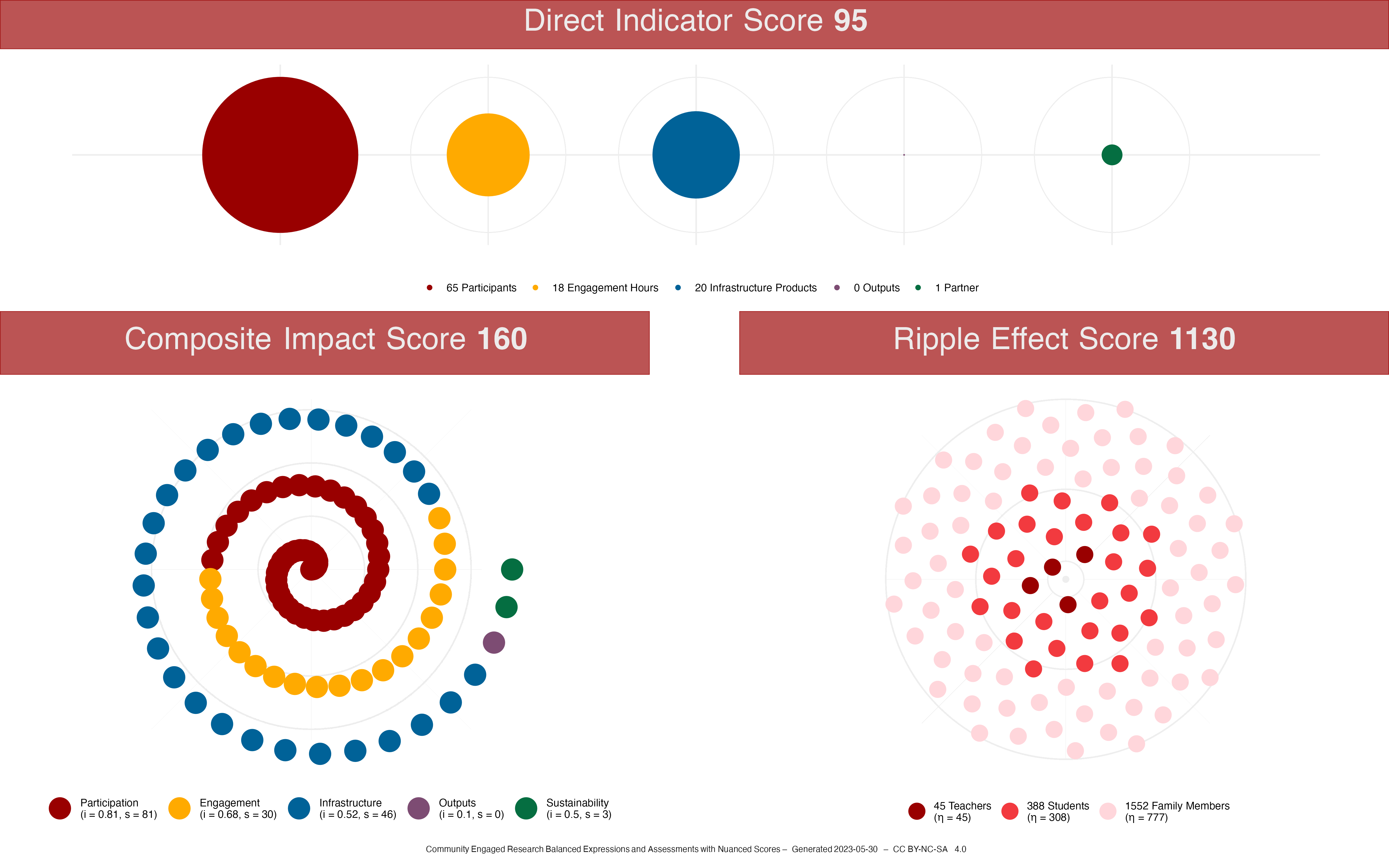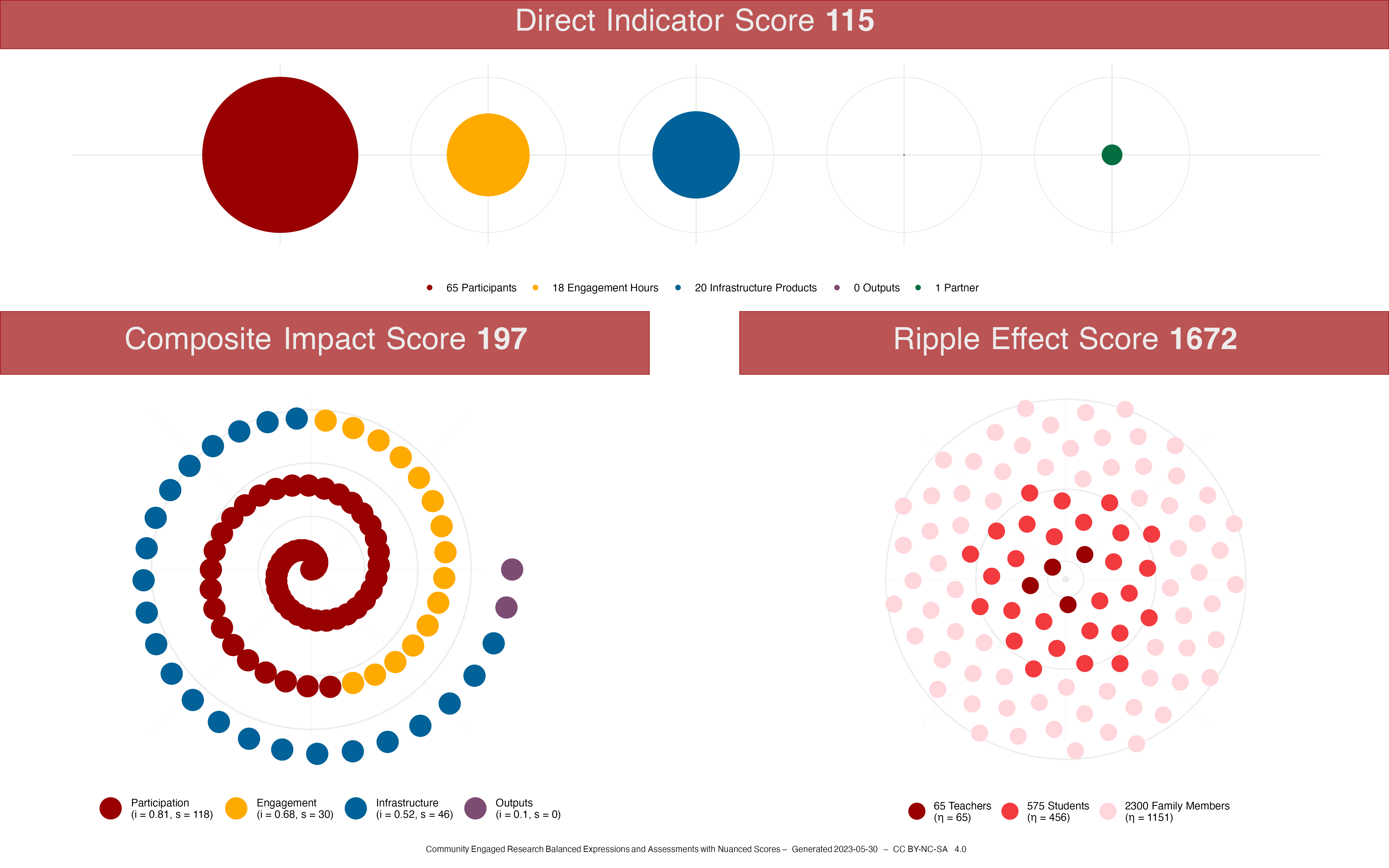 An example of a detailed badge for a professional development program at a school. This badge contains multiple levels of information including the overall score, the ripple effect score, and direct indicators.